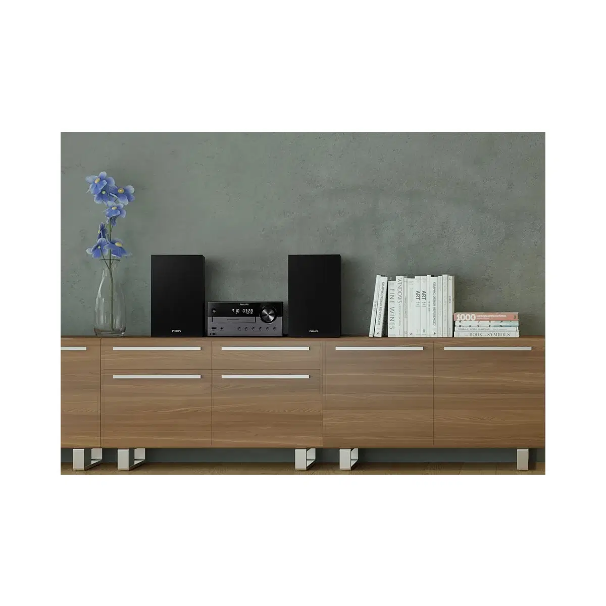 İki renkli merkezi ünite ve hoparlör kabinleri, hi-fi sistemlerinin tasarımını andırır. Dokulu ses kontrol kadranı, hoparlörleri kullanırken hoş bir analog hissi uyandırır. Ünitenin ön kısmında oynatma ve kaynak seçimi için düğmeler bulunur.