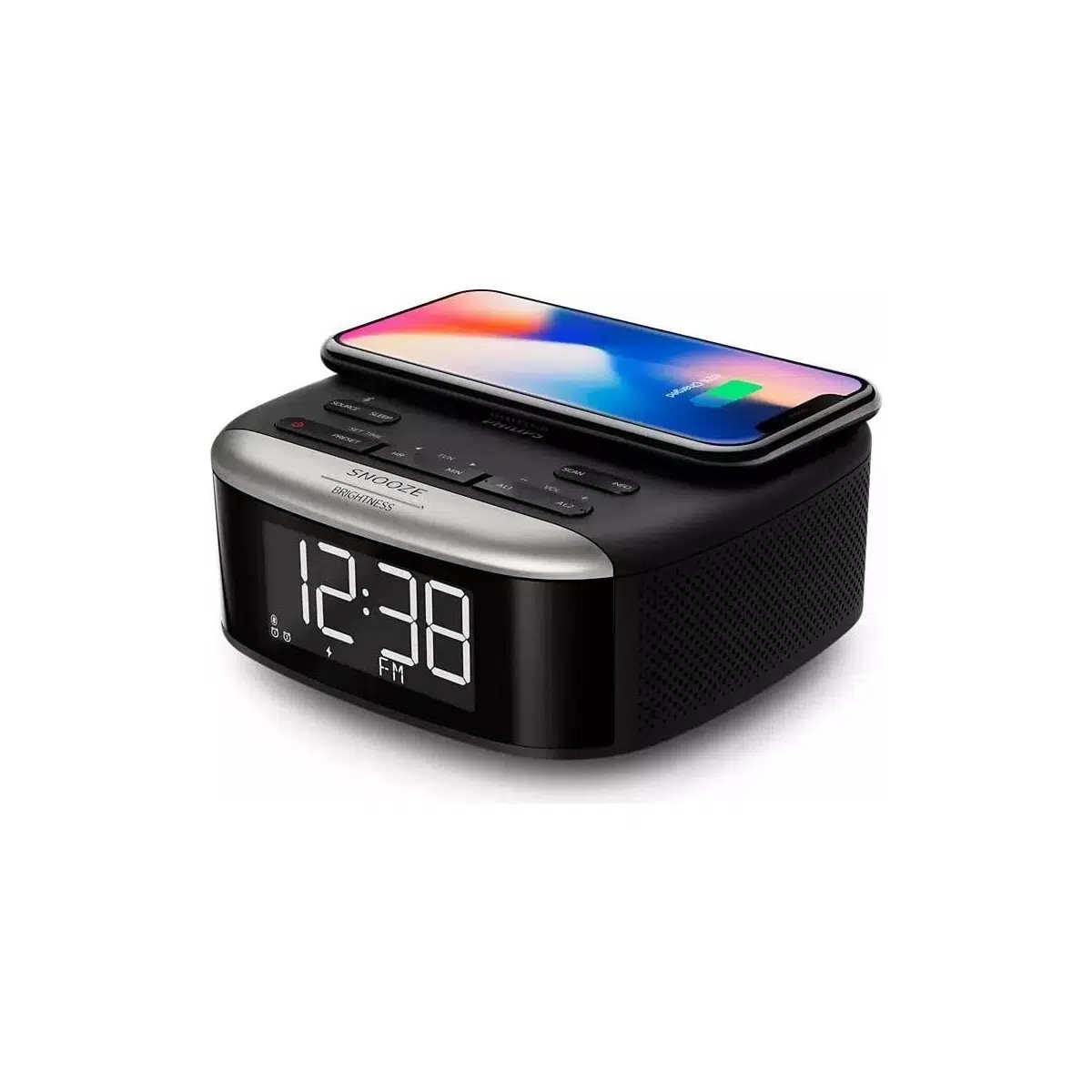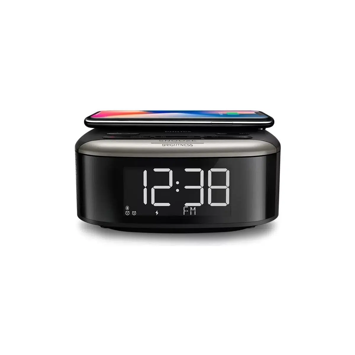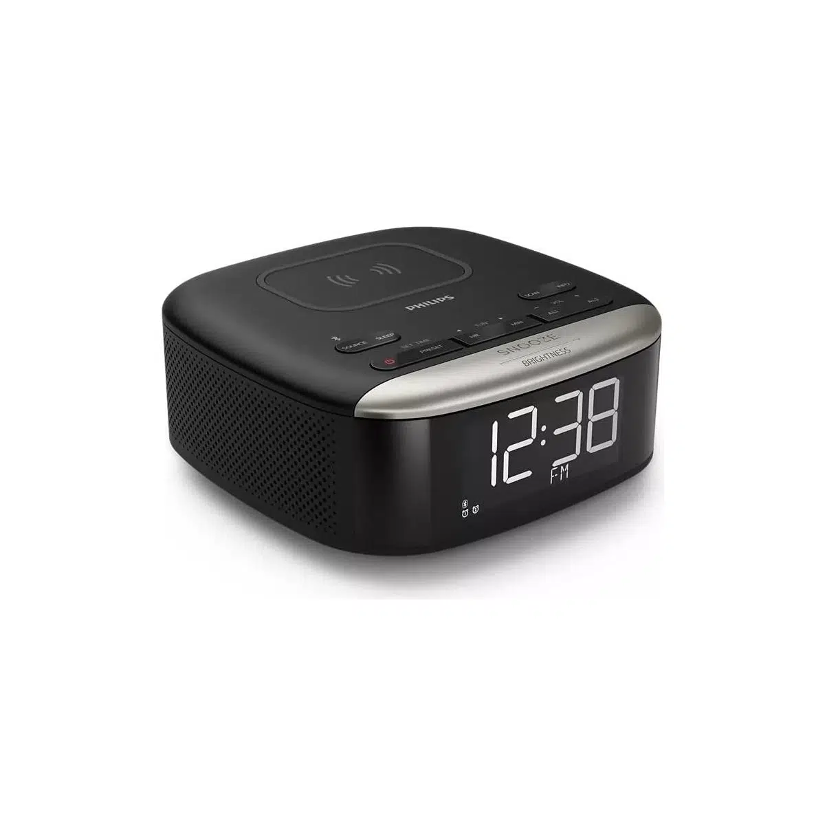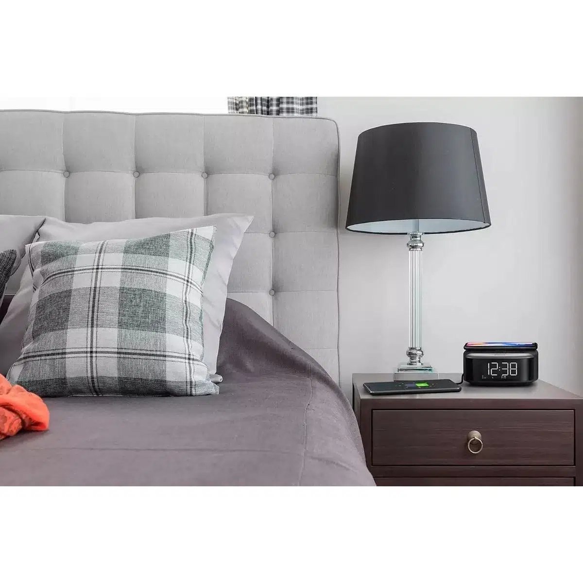 Geniş ve net dijital saat göstergesi, Bluetooth özellikli saatli radyonun önünde parıldar. Temel kontroller üst panelde bulunur. Burada ayrıca telefonunuz için gizli bir kablosuz Qi şarj pedi de bulunur. Kablolu şarj gerektiren telefonlar için USB şarj bağlantı noktası bulunur.
